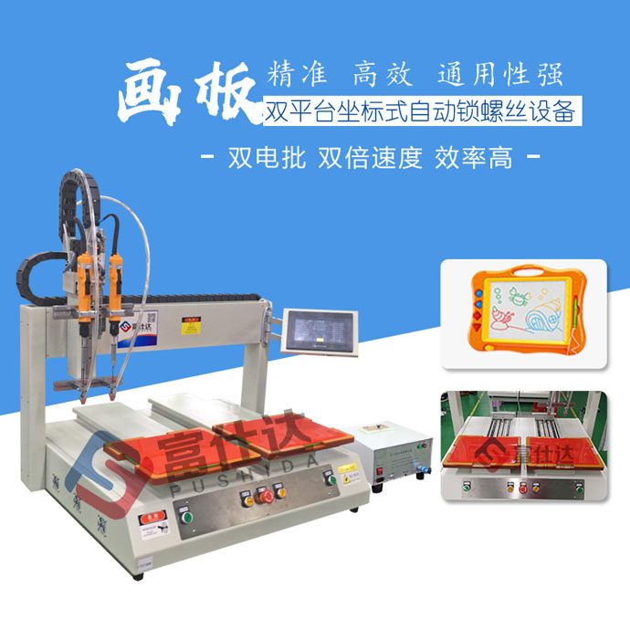 兒童畫板自動鎖螺絲機采用富仕達雙平臺坐標式,配置2把電批一次同時擰好2顆螺絲,效率提升2倍,設計可調(diào)式夾具,滿足多產(chǎn)品生產(chǎn)要求。