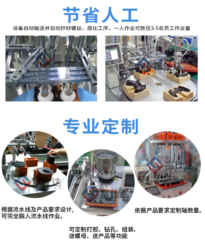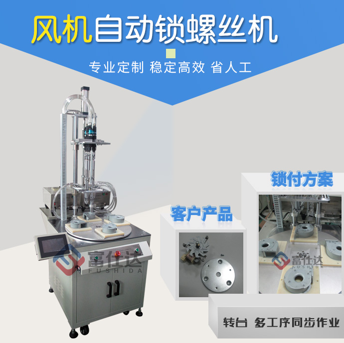 罩極風(fēng)機(jī)外殼采用6顆螺絲緊固,這里配置3臺(tái)自動(dòng)送釘機(jī),并設(shè)計(jì)專用治具來(lái)固定工件,保證鎖付標(biāo)準(zhǔn)。設(shè)備可一次自動(dòng)擰好產(chǎn)品的6顆螺絲,轉(zhuǎn)臺(tái)可實(shí)現(xiàn)多工位同步作業(yè),擰好一件產(chǎn)品僅需3秒左右,一人作業(yè)即可,可節(jié)省3-5名員工。
